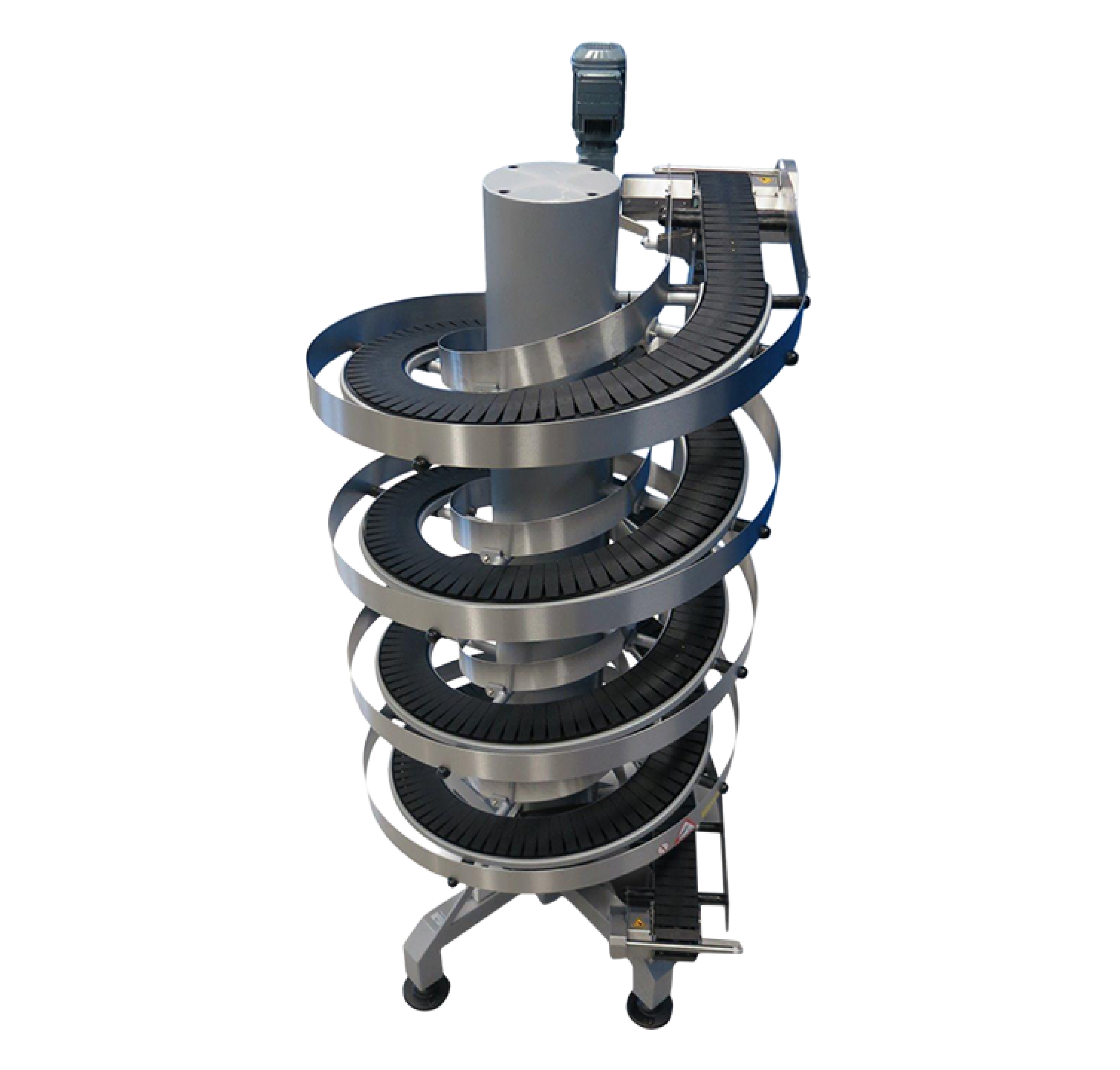 Space-efficient vertical conveying for multi-level transport and accumulation.